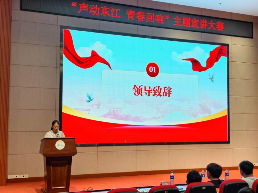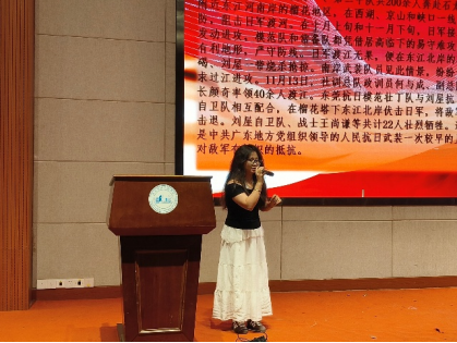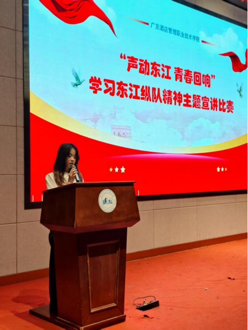 学生处副处长魏春丽首先致辞,代表学校感谢校团委及各二级学院团委的精心筹备,并对参赛学子表示鼓励。她强调东江纵队是“华南抗战的光辉旗帜”和“岭南红色丰碑”,其精神是青年奋斗的力量源泉。
