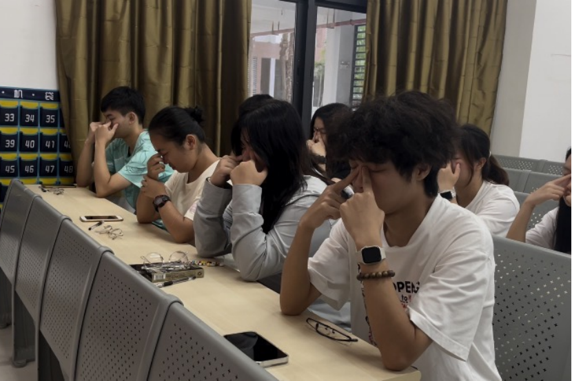 理论科普结束后,进入“实战”环节。,同学们跟随示范视频,认真做起眼保健操。揉天应穴、挤按睛明穴……大家闭眼凝神,放松疲惫的双眼,不少同学表示“做完感觉眼睛明亮了许多”。