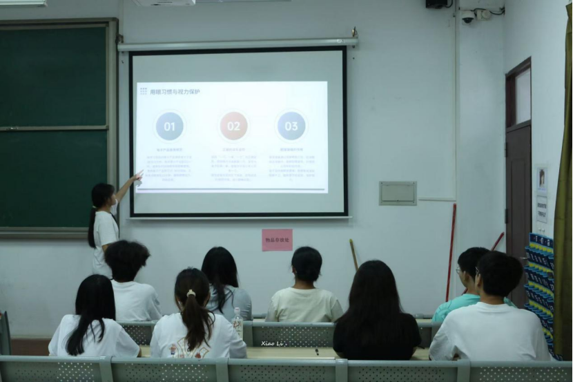 活动开始,邓舒锾化身“护眼小导师”,用幽默风趣的语言为同学们科普爱眼日的由来。从“为什么要设立爱眼日”聊到“日常护眼冷知识”,她结合大学生熬夜刷剧、长时间低头刷手机等习惯,分享了超实用的护眼干货,比如“20 - 20 - 20法则”——每用眼20分钟,抬头看20英尺(约6米)外的物体至少20秒,同学们纷纷掏出手机记录。针对大家关心的近视预防问题,邓舒锾还传授了不少小妙招,现场互动不断。