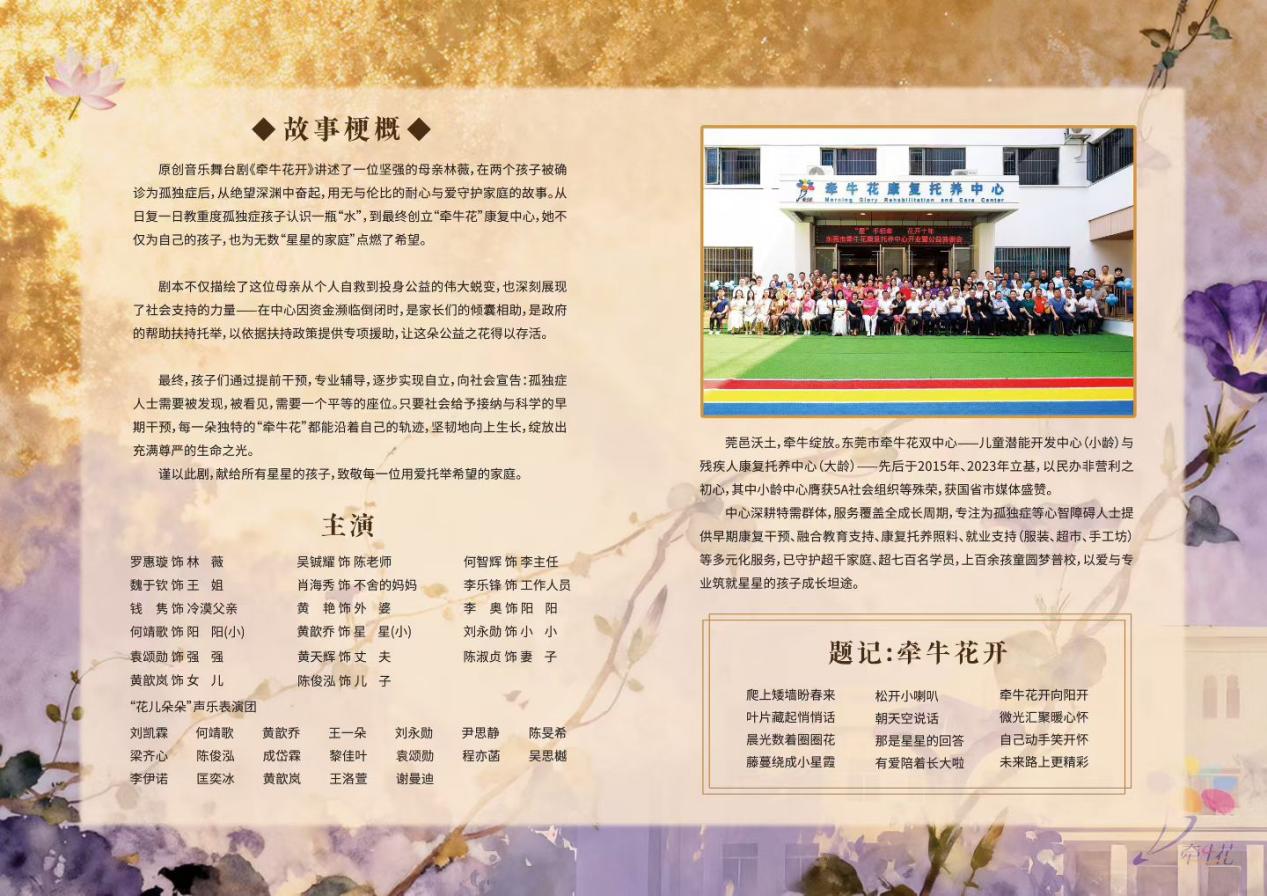 原创音乐剧《牵牛花开》以真实事迹为蓝本,用艺术载体传递社会包容与人文关爱。该剧以东莞市牵牛花康复托养中心创始人李婷为原型,讲述“孤独症儿童妈妈林姐”与“康复工作者陈老师”在困境中彼此守护、顽强向上,最终汇聚成支持花墙的感人故事。《牵牛花开》采用两幕式结构,融合独唱、重唱、合唱及现代舞、情景舞蹈等多种舞台表现形式,精彩演出赢得现场观众阵阵掌声。